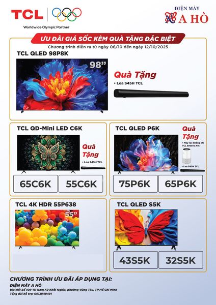 * Giảm giá sâu các dòng Tivi TCL (98P8K, 65C6K, 55C6K, 75P6K, 65P6K, 55P638, 43S5K, 32S5K).