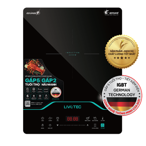 Sở hữu mâm từ 100% đồng với kết cấu 3 vòng nhiệt kép vượt trội tăng diện tích vùng nấu tới 30%, hệ điều hành IGBT tiêu chuẩn Đức và công nghệ E-smart hiện đại, bếp điện từ đơn Livotec E-smart không chỉ giúp nấu nhanh gấp 2, món ăn chín đều, không bị cháy khét mà còn tăng tuổi thọ cho bếp.