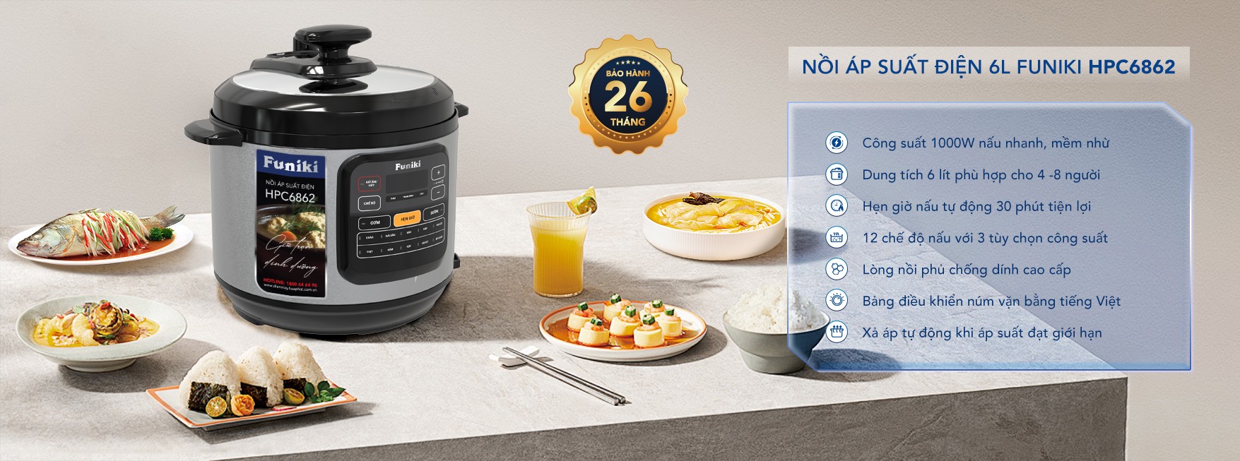 Nồi áp suất điện Funiki 6 lít HPC6862 với công suất mạnh mẽ, 12 chế độ nấu cài sẵn, chức năng hẹn giờ nấu và tính năng an toàn, chắc chắn sẽ trở thành trợ thủ đắc lực trong căn bếp của gia đình bạn. Hãy đến ngay Siêu thị Điện máy HC để mua sản phẩm với mức giá cực tốt kèm nhiều ưu đãi hấp dẫn.