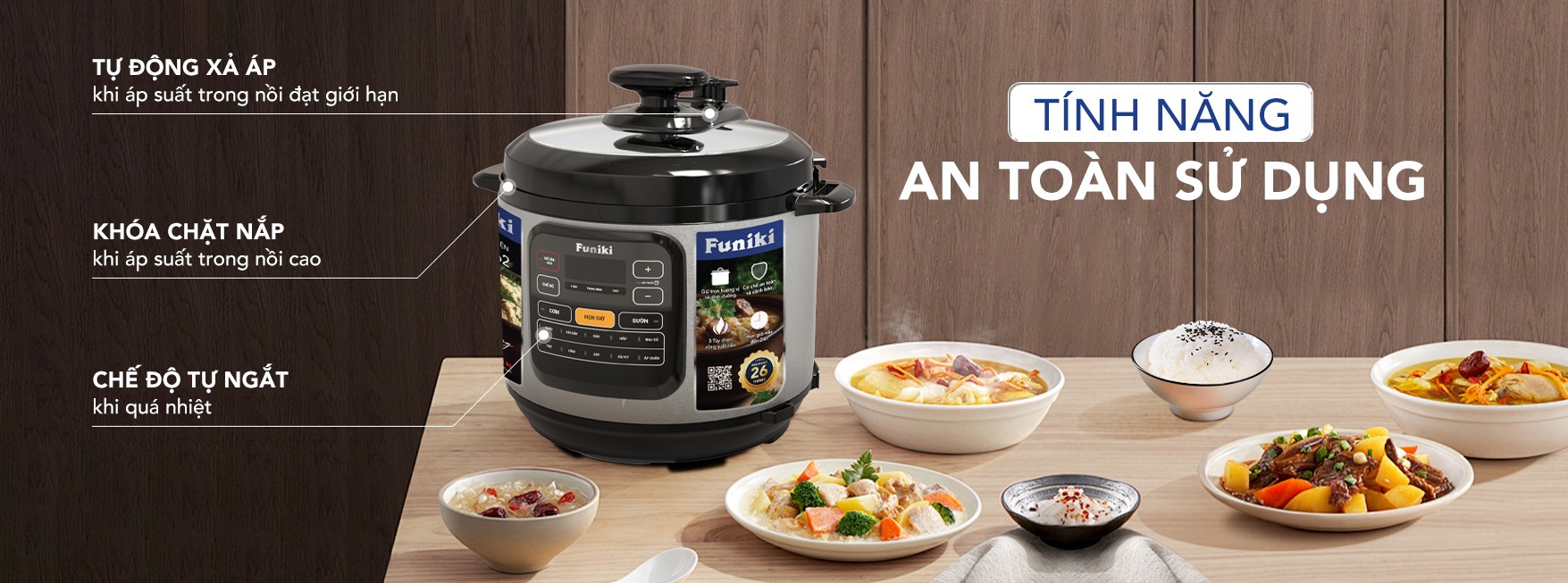 Nồi áp suất điện Funiki sử dụng bảng điều khiển điện tử kết hợp với chú thích Tiếng Việt giúp người dùng dễ dàng thao tác và lựa chọn chế độ nấu mong muốn ngay từ lần lần đầu sử dụng.