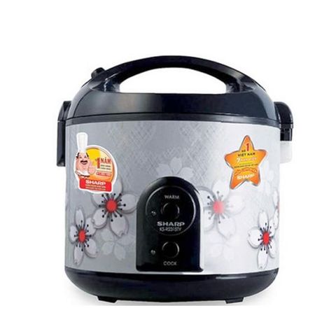 Nồi cơm nắp gài Sharp 2.2 lít KS-R231STV gây ấn tượng với mọi người bằng thân nồi màu xám nhạt trang nhã, các bông hoa 5 cánh xinh xắn được trang trí xung quanh giúp nồi nổi bật.