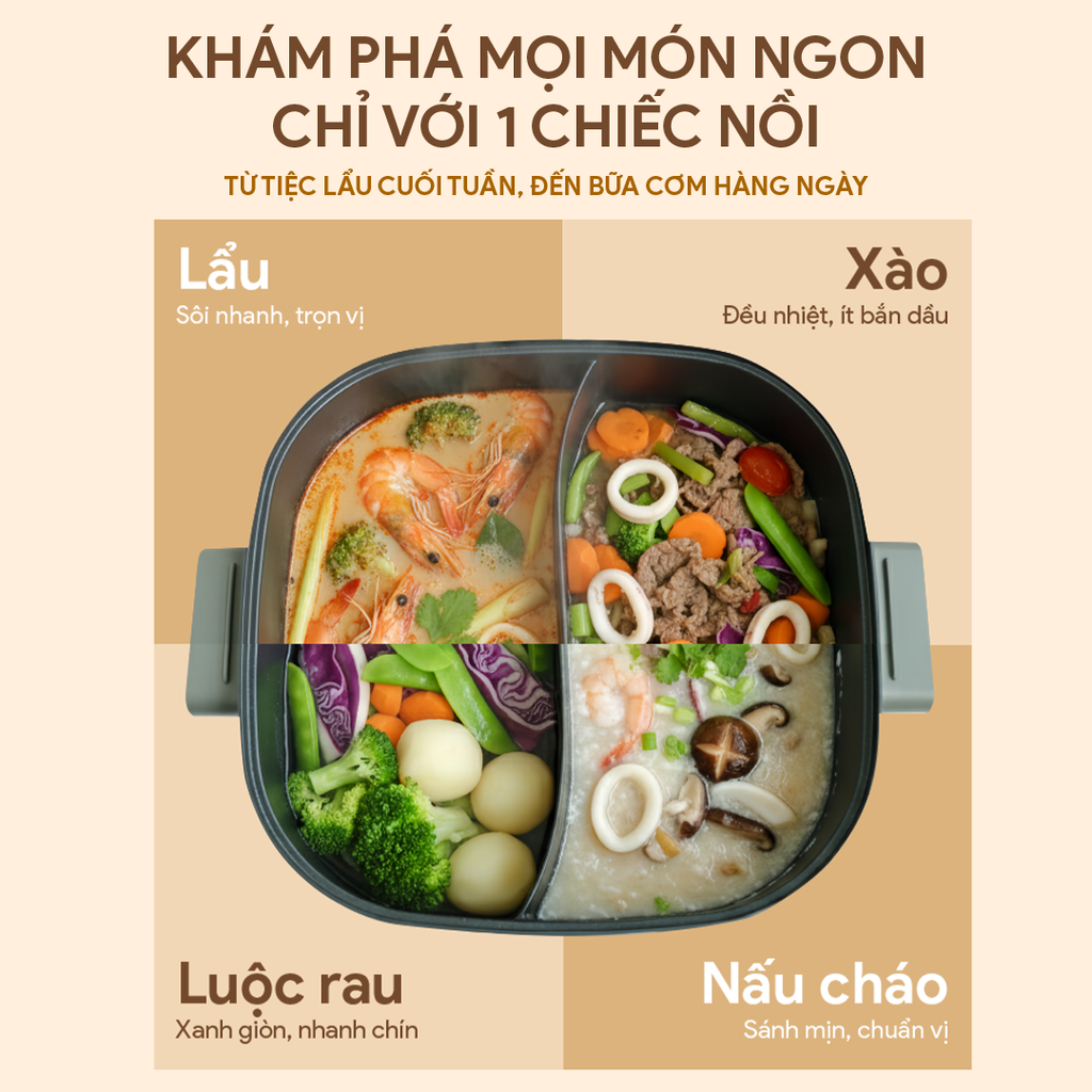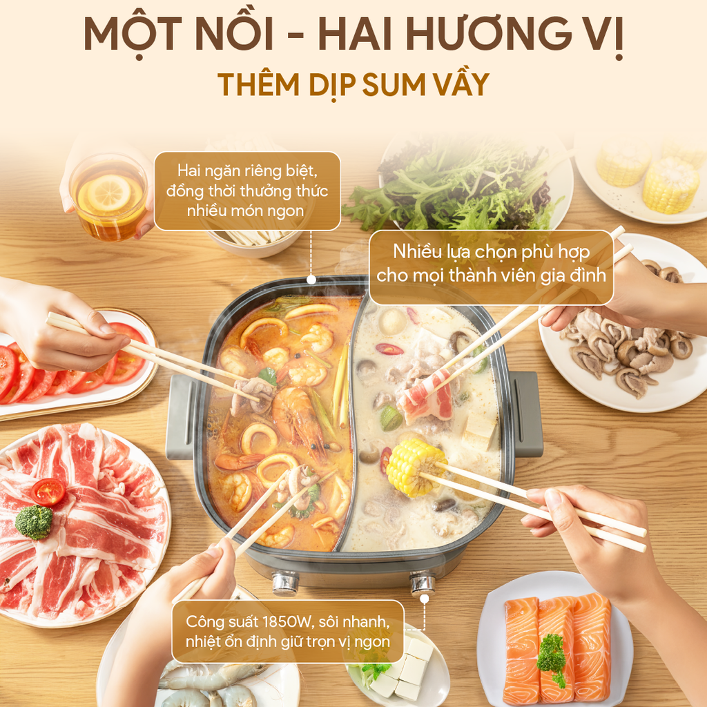 Nồi lẩu điện được trang bị 2 ngăn riêng biệt, cho phép bạn chế biến các món lẩu với hương vị khác nhau, tiết kiệm thời gian và công sức trong bếp. Bạn có thể nấu đồng thời hai món ăn khác nhau như lẩu và xào, luộc hoặc nấu cháo, làm phong phú thêm thực đơn gia đình.